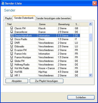 Zunächst wählt man aus der recht übersichtlichen Senderliste in FF Radio Player den gewünschten Kanal aus. Per Mausklick verbindet sich die kostenlose Software mit dem entsprechenden Streaming-Server und startet die Wiedergabe. Nicht in der Liste vorhandene Sender trägt man bei Bedarf manuell selbst ein. Dazu benötigt man allerdings alle entsprechenden Daten, inklusive Streaming-URL. Vorhandene Sender lassen sich darüber hinaus bewerten.